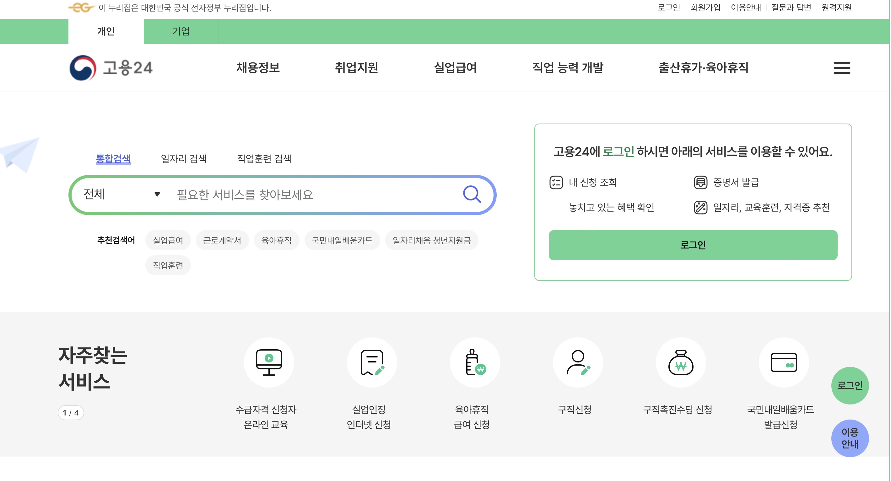 고용24시 홈페이지에서는 크게 개인과 기업 두 가지로 나뉘어 서비스를 제공하고 있습니다.
