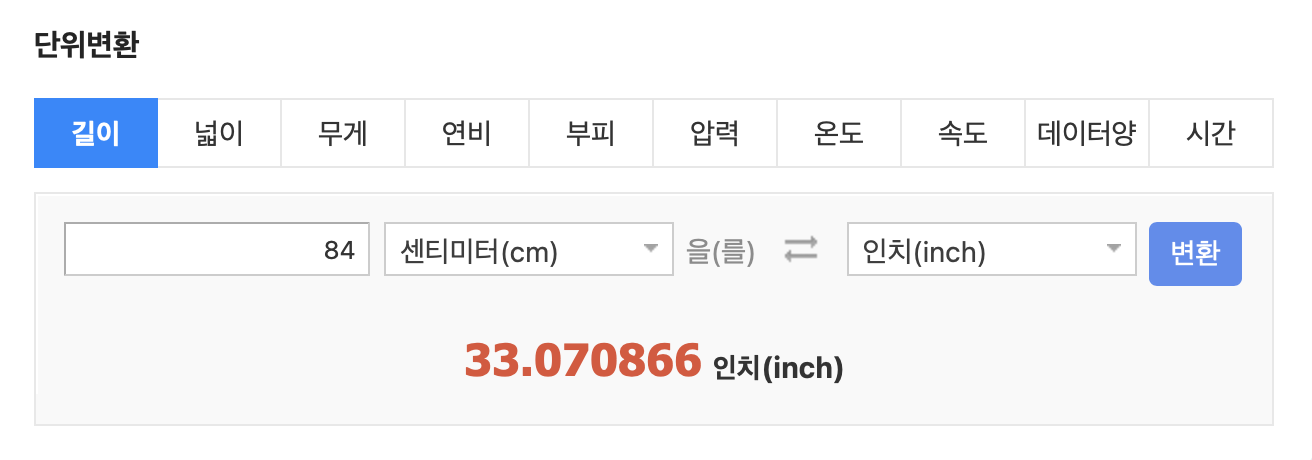 허리둘레 84 센티미터(cm) 를 인치(inch) 로 변환하면